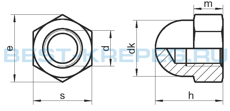 Гайки колпачковые DIN 1587 высокие в отличие от стандартных имеют сферический колпачок высотой 7 – 52 мм, при диаметре внутренней резьбы: М3 – М30 мм. Нижняя часть изделия выполнена в виде классического шестигранника с шириной по граням от 5,5 до 46 мм, что позволяет производить надежное завинчивание с применением накидных или рожковых ключей, а также автоматических гайковертов с контролем затягивающего момента.