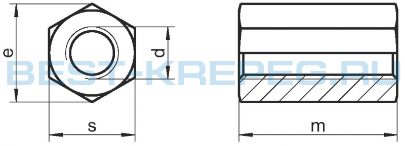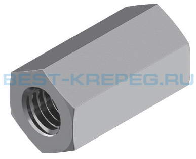 Гайки шестигранные высокие DIN 6334 высота = 3xd – так называемые шестигранные резьбовые муфты. Применяют в качестве соединительного элемента при наращивании и удлинении резьбовых изделий: шпилек, болтов, штифтов или анкеров с резьбой. Имеют широкую область применения, в основном в машиностроении и станкостроительной промышленности, часто в высотном строительстве при использовании современных сверхпрочных конструкций. Согласно нормативам DIN и ГОСТ длина соединительной резьбовой муфты равна трем ее внутренним диаметрам. В данном случае, представлена линейка изделий с диаметром внутренней резьбы от М5 до М30 и высотой корпуса, соответственно, от 15 до 90 мм. При этом внешние размеры по плоскостям составляют 8-46 мм, а по граням 8,79-51,28 мм.